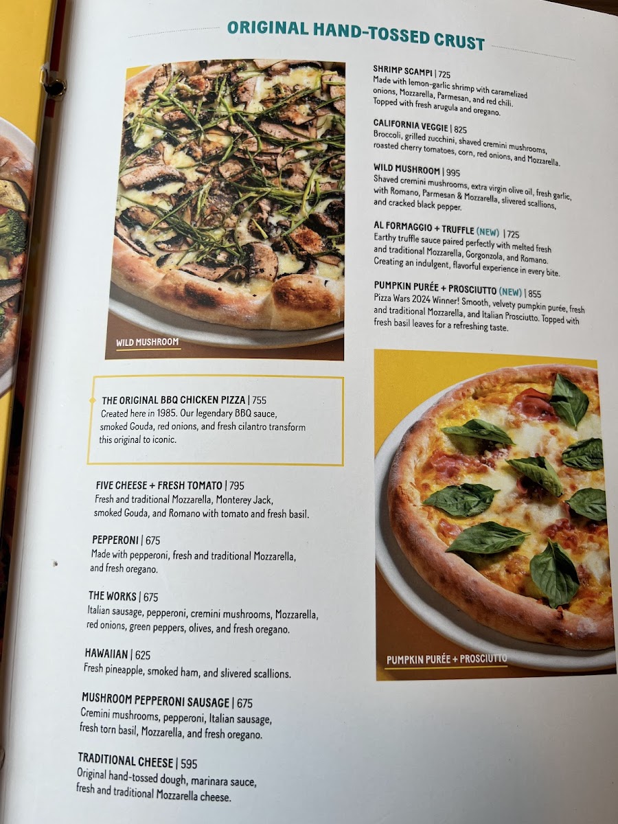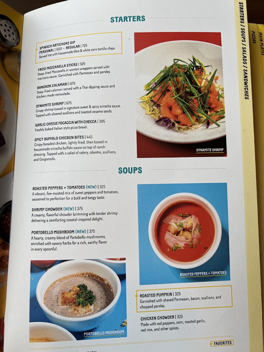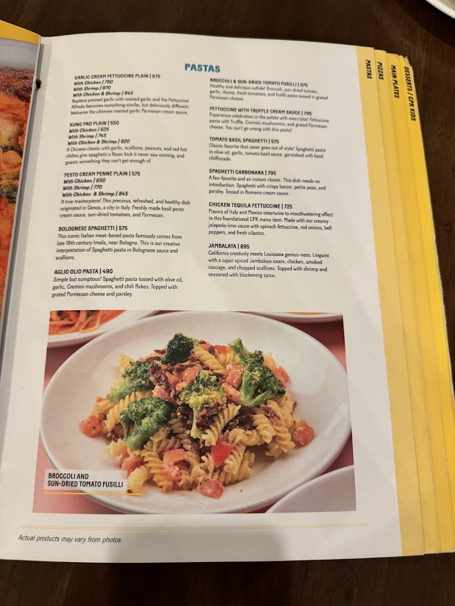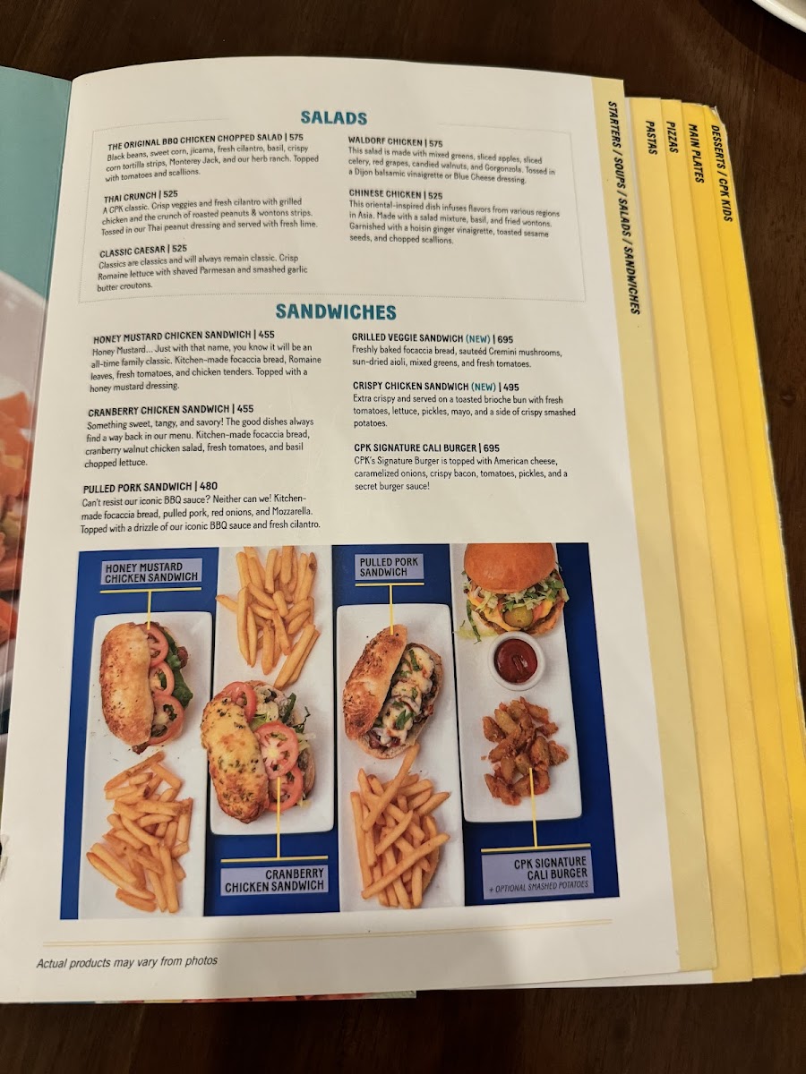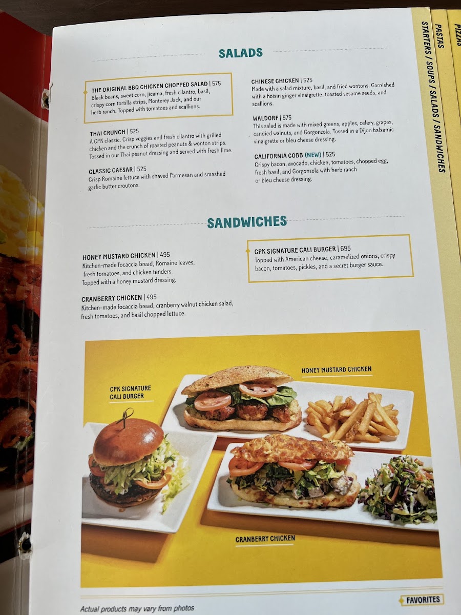 The menu at California Pizza Kitchen in Ortigas Center offers a diverse and tempting selection of dishes that cater to all tastes. For starters, the Spicy Buffalo Chicken Bites and Bangkok Calamari stand out as flavorful appetizers, while the Personal Dynamite Shrimp and Fried Mozzarella provide a crispy, indulgent touch. The pizza selection features classics like the Traditional Cheese Pizza and unique options such as the Shrimp Scampi and Al Formaggio + Truffle Pizza, with prices varying according to the dish. If you're in the mood for a sandwich, the Cranberry Chicken Sandwich offers a delightful, refreshing choice. For those craving a heartier meal, the Grilled Pork Chop and Chicken Milanese are standout main plates, along with the Beer Battered Fish Fillet and Roasted Salmon. The restaurant also boasts a selection of Signature Chicken Wings, including the Kung Pao Chicken Wings and Buffalo Chicken Wings, each with distinct, bold flavors. When it comes to pastas, the Fettuccine with Truffle Cream Sauce and The Bolognese are top picks, while the Jambalaya offers a spicy, satisfying option. The Crispy Thin Crust Pizza comes with mouthwatering choices such as Jamaican Jerk Chicken and Pepperoni Supremo. Salads like the Chinese Chicken Salad and Waldorf Chicken Salad provide a fresh and healthy complement to the meal. For dessert, the Chocolate Souffle Cake is a decadent way to finish the experience. With a menu filled with an array of tempting dishes, California Pizza Kitchen in Ortigas Center delivers a satisfying dining experience for every palate.